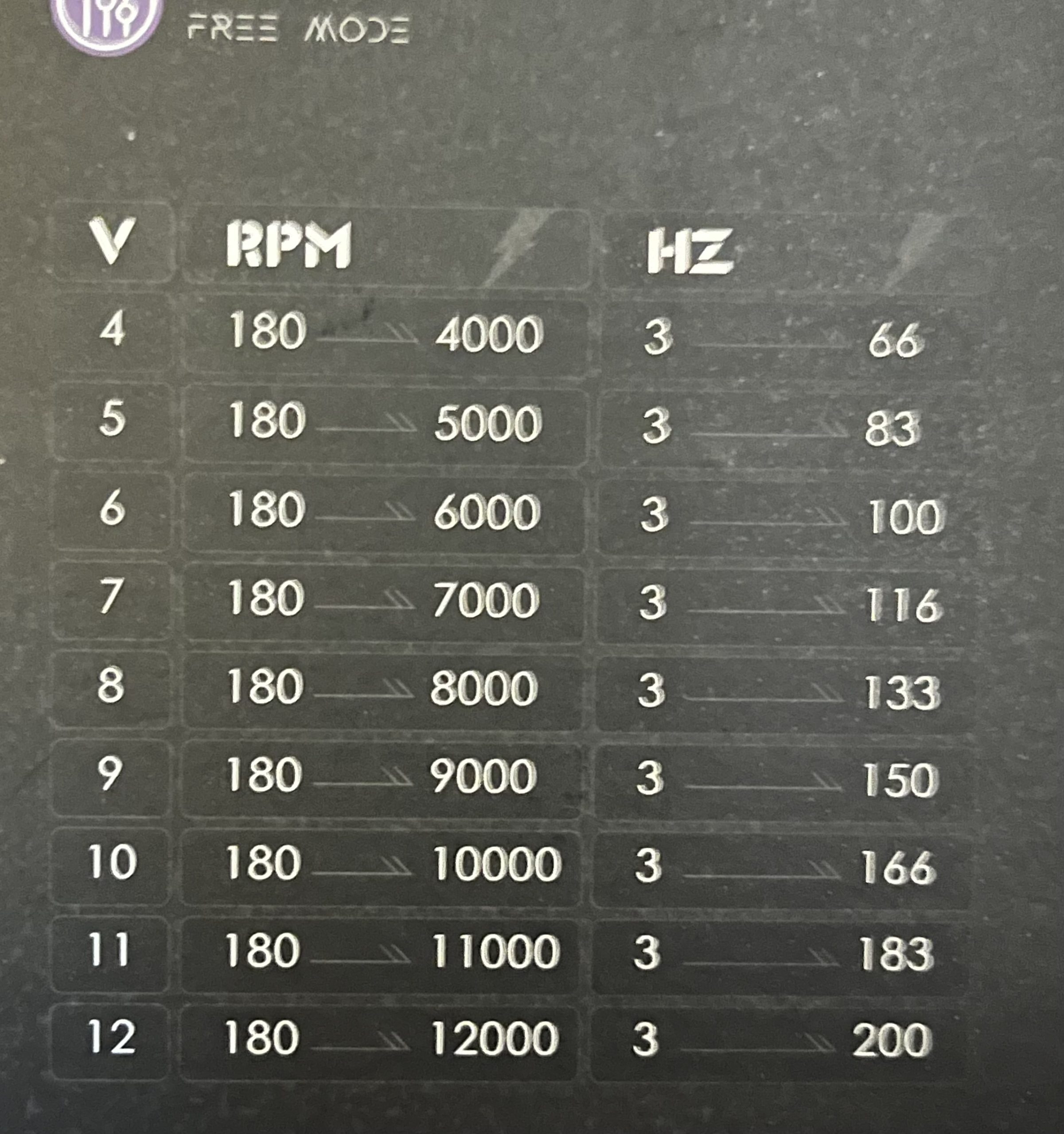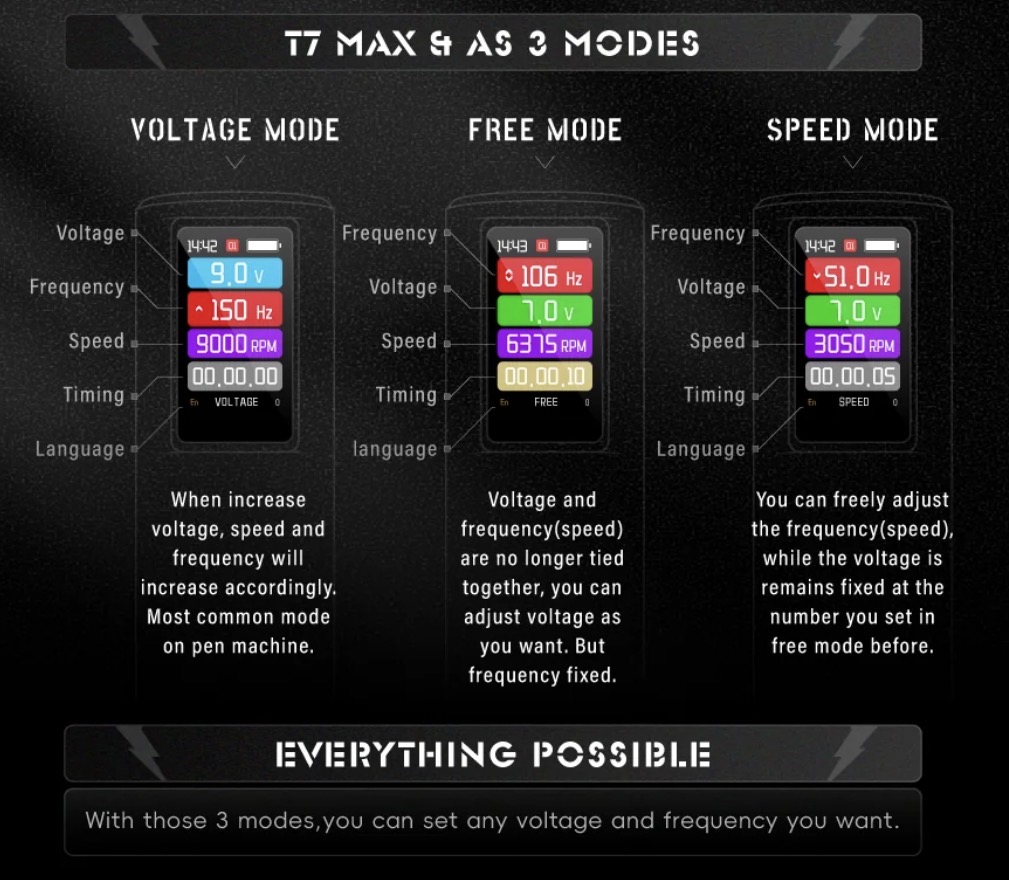 Operates like a standard pen machine where voltage, speed, and frequency are interdependent.