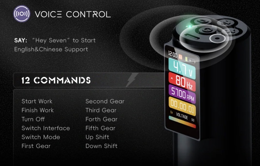 Benutzer können 12 Befehle aktivieren, indem sie „Hey Seven!“ sagen, um die Geschwindigkeit anzupassen, den Modus zu ändern oder die Sitzung freihändig zu starten/zu beenden.